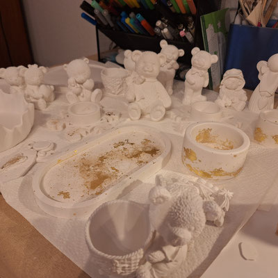 In meiner Werkstatt geht es oft um kleine Wunder im Unsichtbaren: Blattgold, das ich in Formen lege, Keramikgießpulver, das darüber gegossen wird, und dann der Moment, in dem die Gießlinge aus der Form kommen.